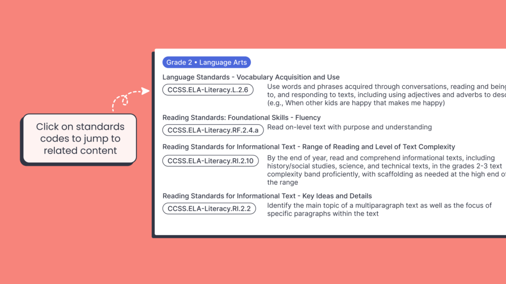 - Search by standards codes – Instantly find standards-aligned videos using codes like CCSS.Math.Content.3.G.A.2 or CCSS.ELA-Literacy.RI.8.4.