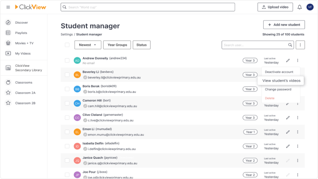 Administrators can now view all the videos uploaded by students and easily manage their videos in ‘Student Manager’. This can be accessed through the ‘Settings’ page under your account avatar in the top right-hand corner.