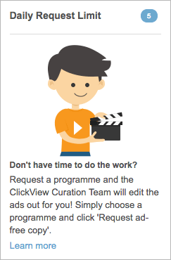 Please note that there is a limit on the number of requests you can send the ClickView Curators. Each user can request up to 5 new ad-free programmes per day. However, for any programme that has previously been requested by other users (with a red ‘ad-free’ badge), you can of course add as many of those to your Workspace as you like!