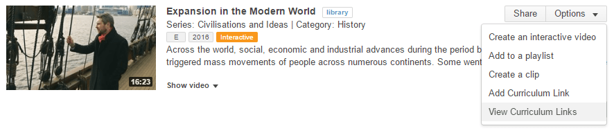 - Within your search results, click the ‘Options’ drop-down on any video to see which outcomes a video is mapped to via ‘View Curriculum Links’.