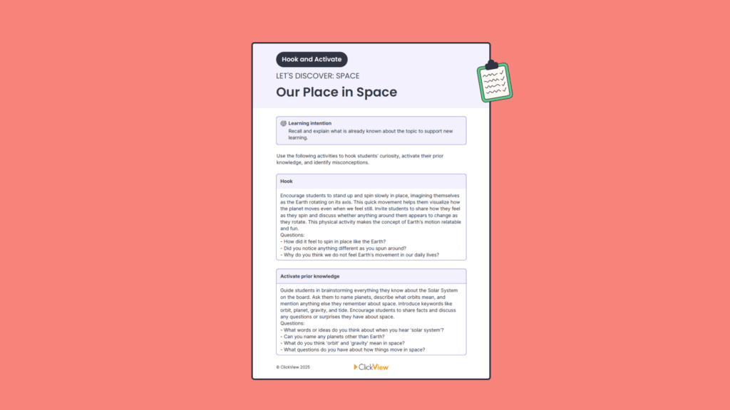 “Hook and Activate” is a one-page resource designed to help teachers set students up for successful learning before watching a video. Each guide includes a “Hook” to spark curiosity and an “Activate Prior Knowledge” task to connect new learning to what students already know. This approach supports inclusive practice, reduces cognitive load, and gives all learners a meaningful entry point into the topic.
