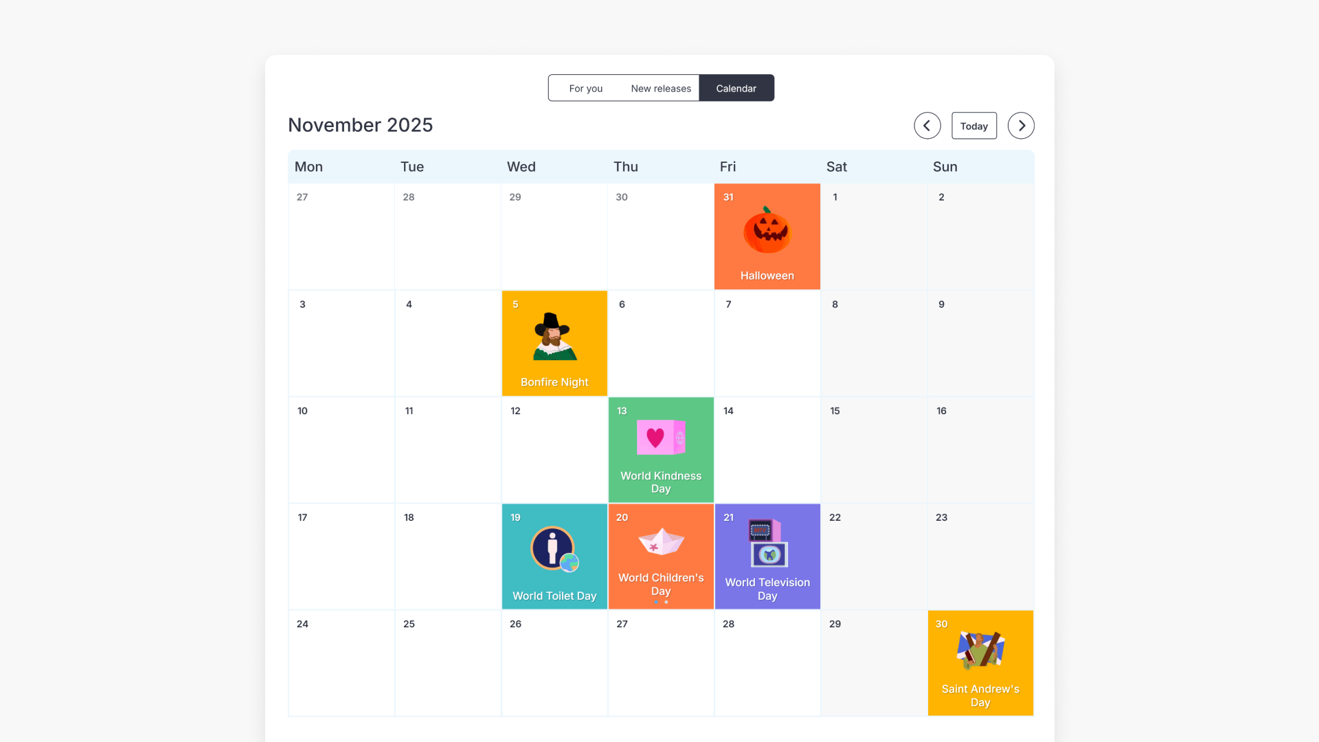 The Special Events Calendar helps educators plan lessons around key global and national dates. It displays upcoming and recent events such as holidays, commemorations, and awareness days, including Easter and Remembrance Day. This makes it easier to connect classroom learning to real-world events observed across year groups.