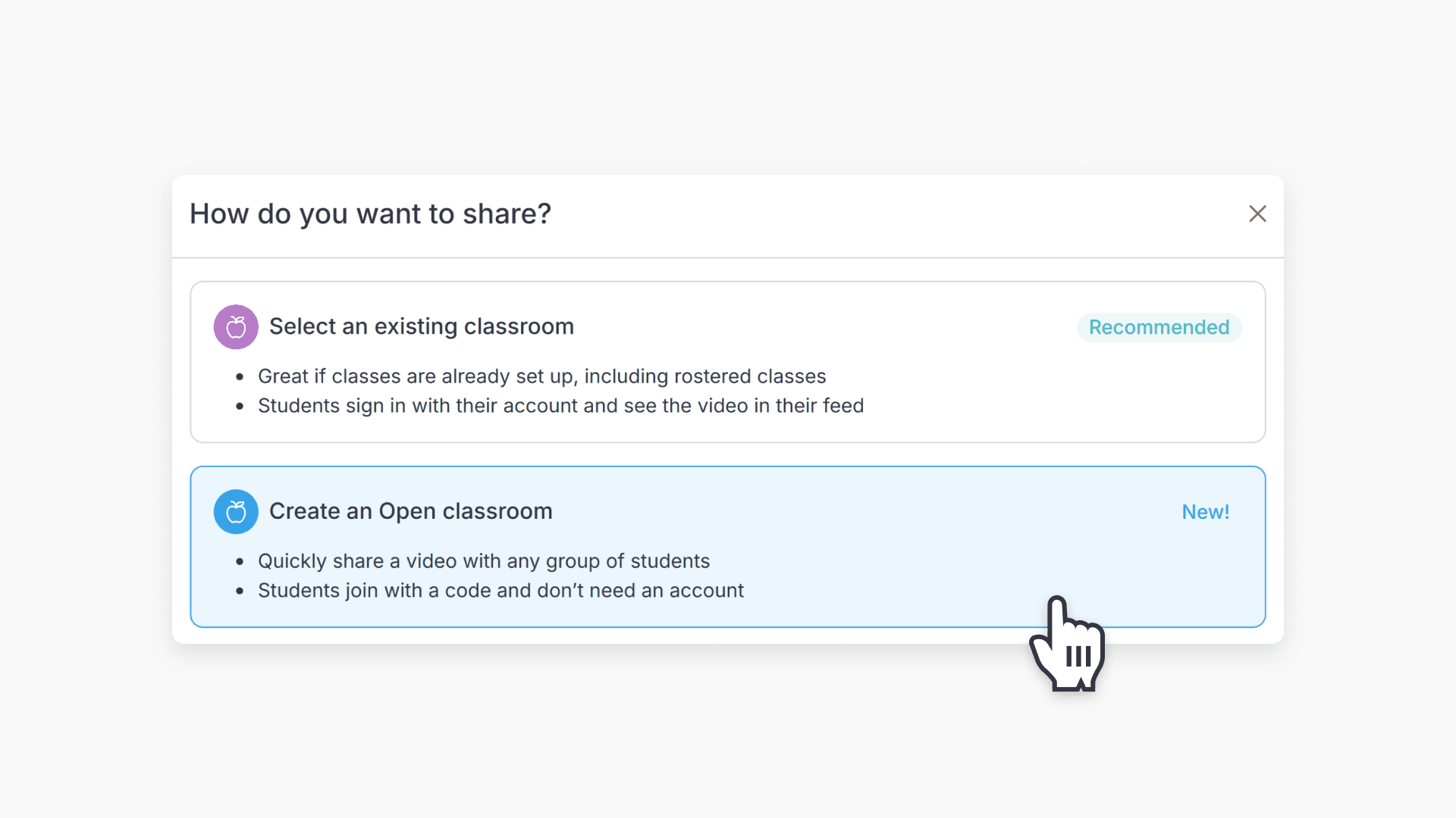 Open classrooms provide teachers with a simple way to share educational videos with students without having to set up classrooms in ClickView. Teachers remain in control of how students interact with each assigned video.