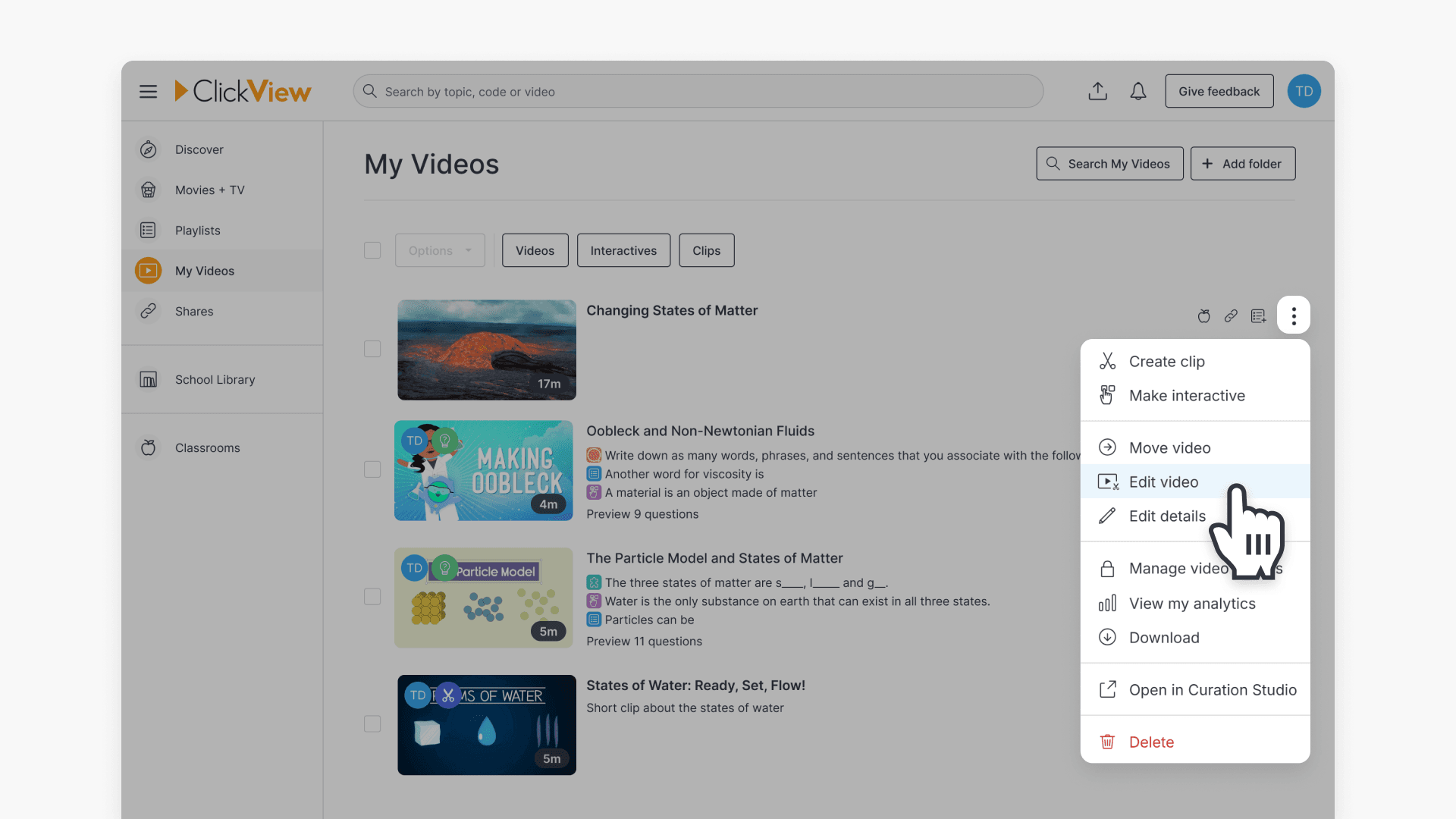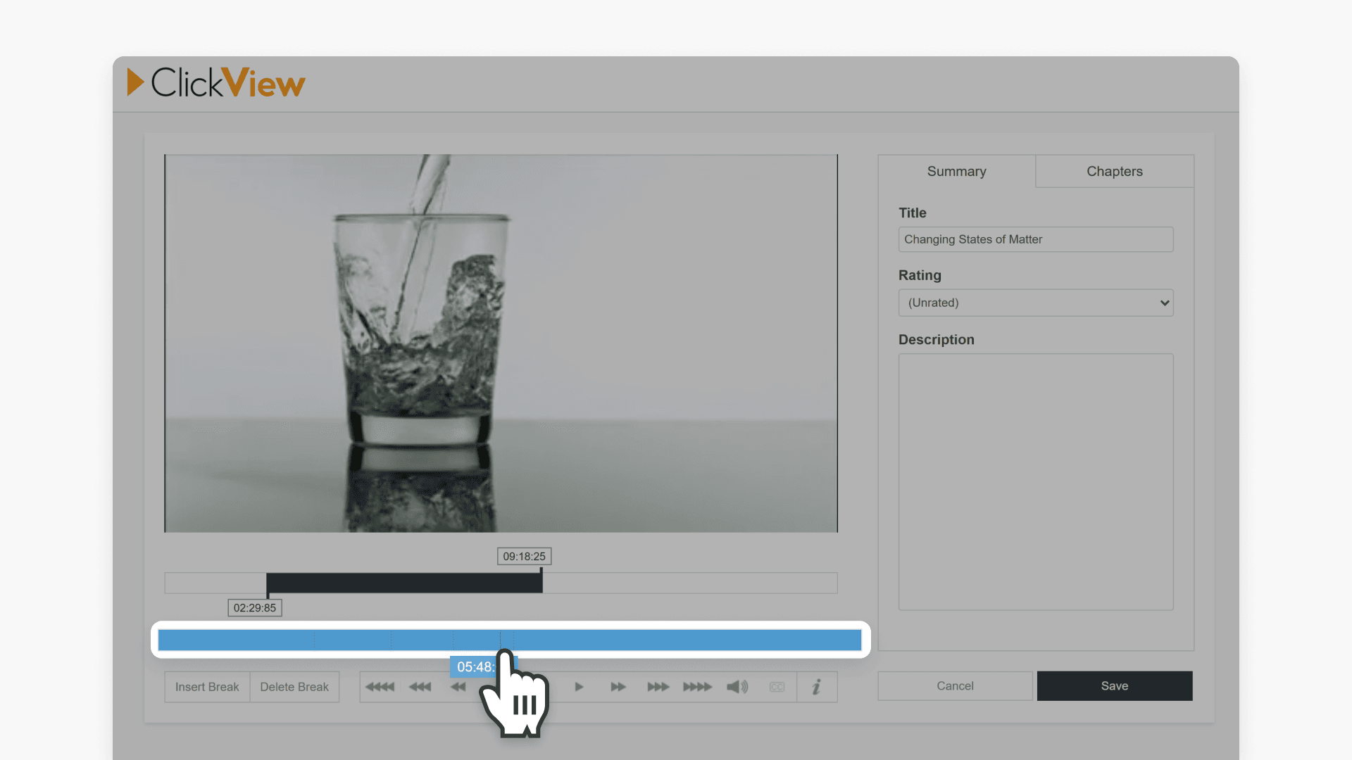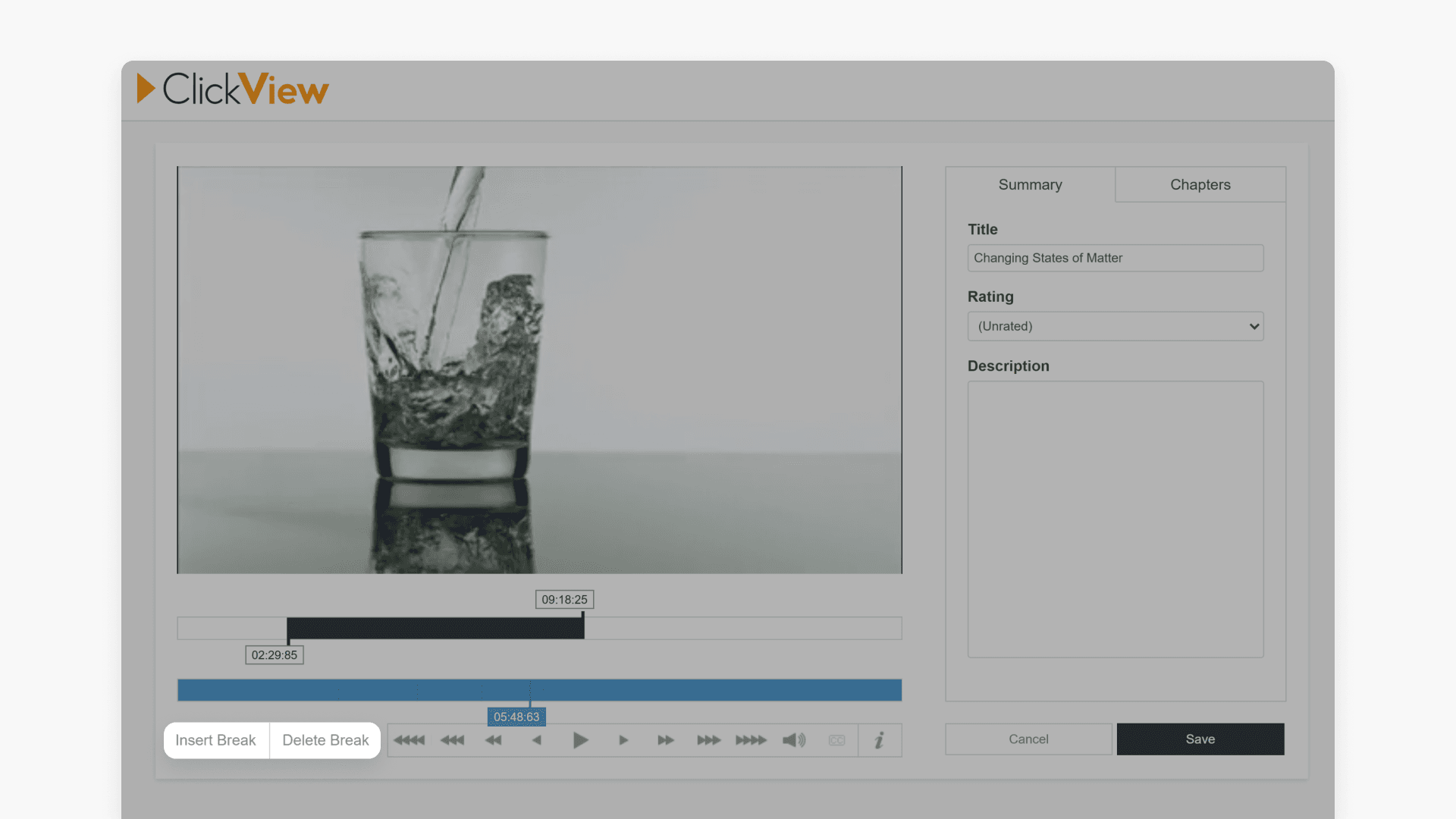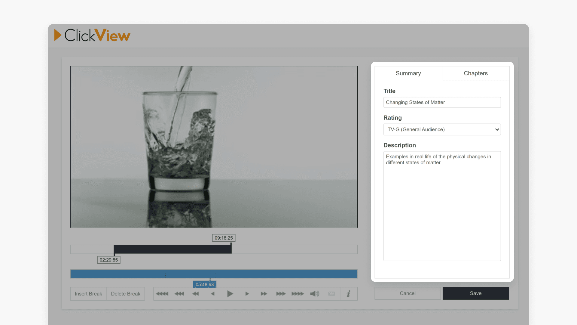 With ClickView, educators can update video metadata, including the title, description, rating, chapters, and duration. Adding video chapters helps present focused content for class activities.