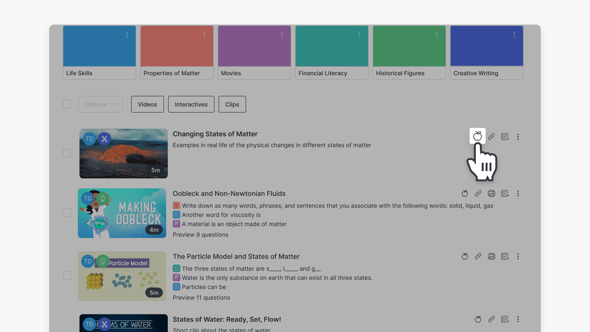 - Your saved content, including videos, clips, and interactive quizzes, appears in a list view.